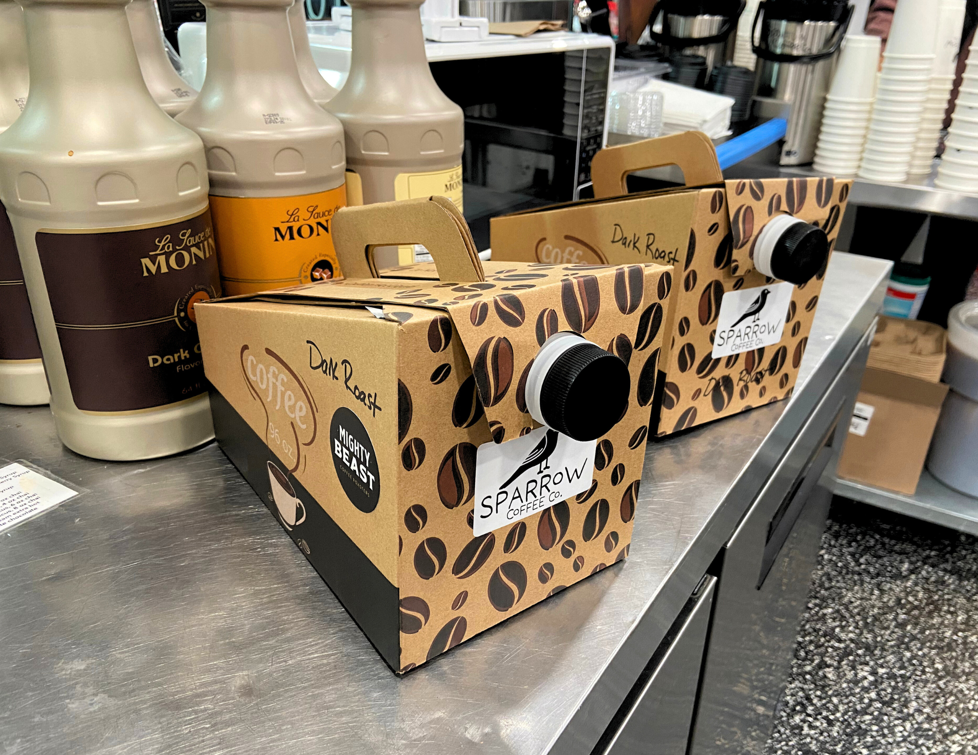 Sparrow offers to-go coffee boxes that do not need to be returned. We can also provide you coffee in airpots with cream pitchers!